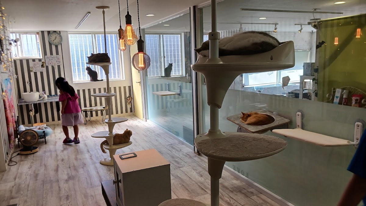 As you step inside, you’re embraced by a warm atmosphere filled with the comforting scent of furry companions. The cafe is divided into distinct zones, including a dog cafe area, a cat cafe nook, and an intriguing reptile section, making it a haven for animal enthusiasts.